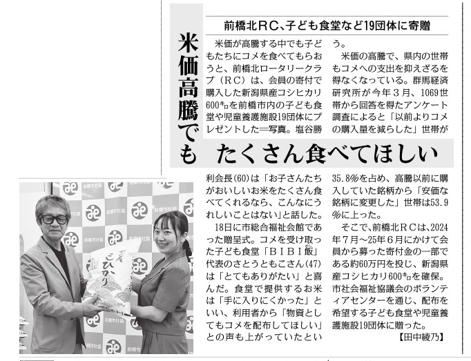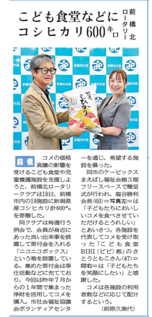 6月18日、米の高騰で困窮するこども食堂と児童養護施設19団体に、社会福祉協議会ボランティアセンターを通じて新潟魚沼産コシヒカリ600キロを寄贈しました。寄贈式はケービックスまえばし福祉会館で行われ、今回は事前にプレスリリースを各メディアに配布し、多くのメディアが寄贈式を取材してくれました(上毛新聞様、毎日新聞様、群馬テレビ様、NHK様、ありがとうございました!)。